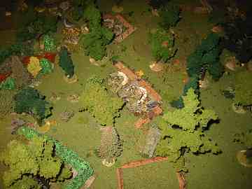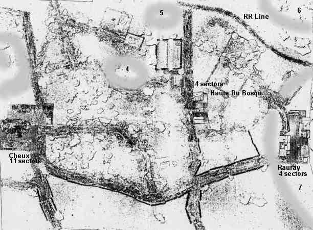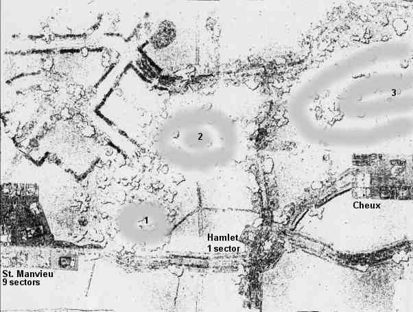 West game board. Hedgerows on left half of the board, normal hedges on the right half. Hills are numbered and number of contours indicated. All hills are gentle slopes. Towns show the number of 3" by 3" sectors included.